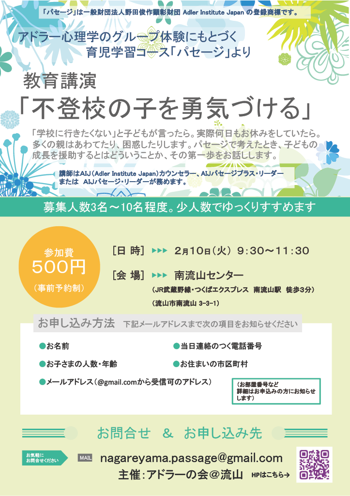 2026年2月10日(火)に、千葉県流山市で、アドラー心理学にもとづく教育講演『不登校の子を勇気づける』が開催されます。みなさまお誘いあわせのうえお気軽にご参加ください。