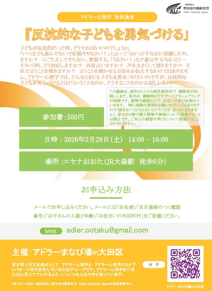 2026年2月28日(土)に、東京都大田区で、アドラー心理学にもとづく教育講演『反抗的な子どもを勇気づける』が開催されます。みなさまお誘いあわせのうえお気軽にご参加ください。