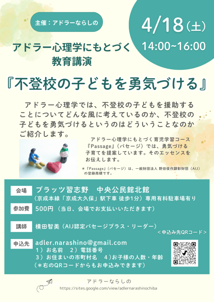 2026年4月18日(土)に、千葉県習志野市で、アドラー心理学にもとづく教育講演『不登校の子どもを勇気づける』が開催されます。みなさまお誘いあわせのうえお気軽にご参加ください。