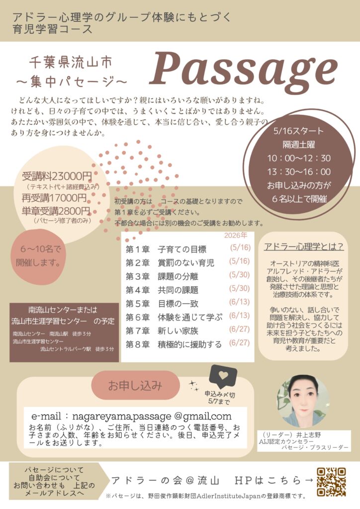 アドラー心理学にもとづく育児プログラム Passage(パセージ)土曜日コースが、2026年5月16日(土)から流山で開催されます。今回は、一日に2章ずつ進む集中パセージです。