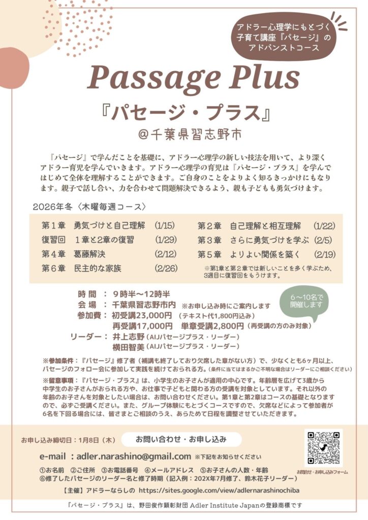 アドラー心理学にもとづく育児プログラム Passage(パセージ)のアドバンスドコースが、2026年1月15日(木)から流山で開催されます。